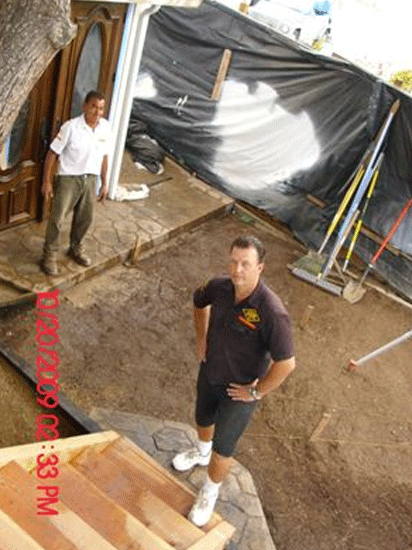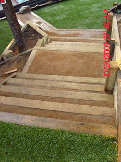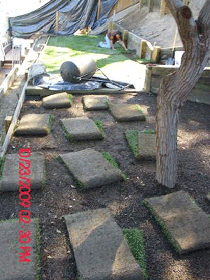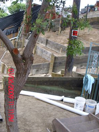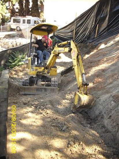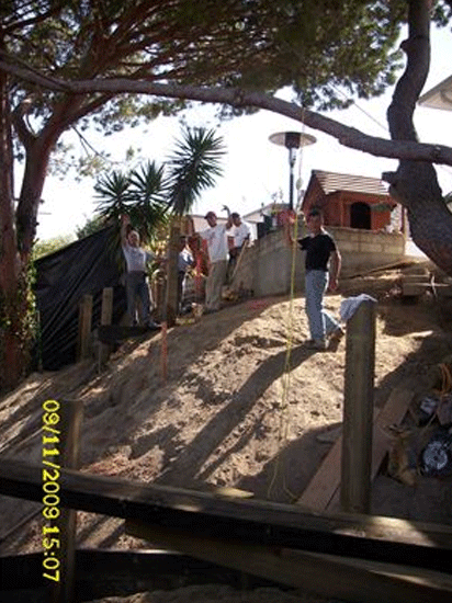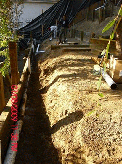 The landscape design was a MAJOR challange. Our goal was to make a completely unusable slope (1-1 slope) into a usable back yard with as much flat space and usability as possible. It started with major excavations, grading and compaction. We removed and recompacted to design over 1000 cubic yards of material over 2 months. Once we passed soils engineering and testing we began the INSTALLATION you can veiw in the photos that follow.