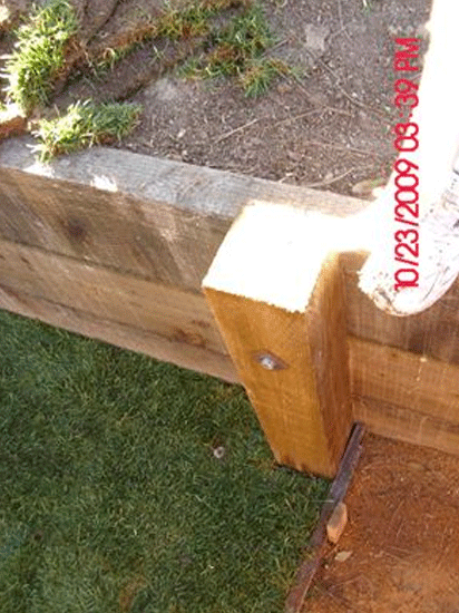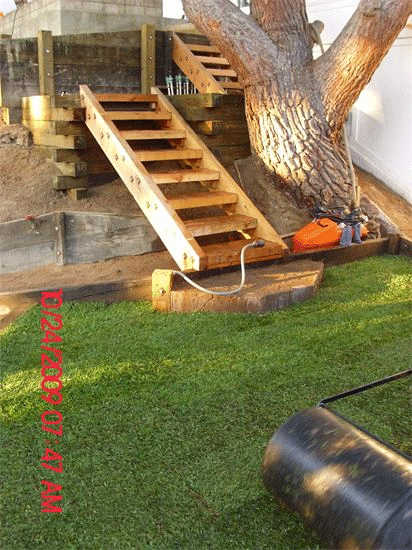 The landscape is a LambCon Original Hillside Design™. We started the INSTALLATION in early September and includes over 400' of low garden tie retaining walls traversing and reinforcing the hillside, 800+ sqft of Premium SOD on three levels, 20 Tons of DG (decomposed granite) walkway surface, 800 sqft of 3 color stamped concrete walkway and 1000+ sqft of Planter space- complete with a 5 station sprinkler system on timers.